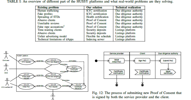 To start with abuse and illegal effect has embedded the whole century due to the lack of body to fight against irregular actions of the usage of sex workers. According to the published journal by Peter Tulala _, Natasha Ivanovic y, John D. Allen z, James Kupka x, Mina Vucinic, sex workers( or prostitution) is defined as the business or practice of engaging in sexual activity in exchange for payment either as money, goods, services or some other benefit agreed upon by the transacting parties. There are a variety of challenging problems faced by participants in this industry – namely, illegal sex work, human trafficking, violence against women and children, increased probability of transferring sexually transmitted diseases (STDs), time-wasting clients or false rape accusations. With all this issues bring forth the idea and the concept of creating Hussy platform, the main value proposition of this project is to create a decentralized platform and to provide incentives for both sex workers and their customers around the globe for safer engagement in paid sex services.