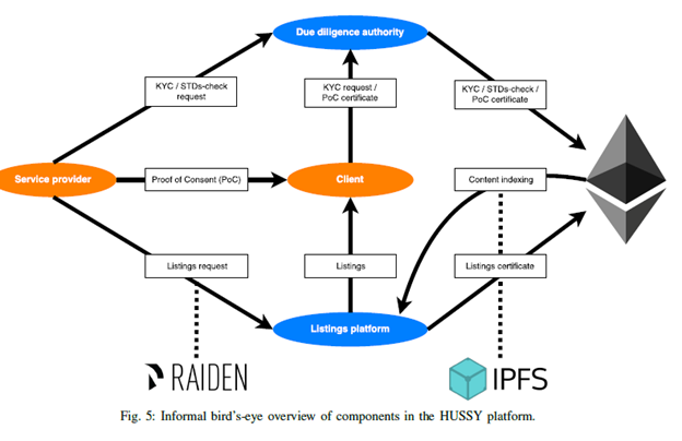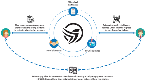 Hussy platform will defend the free market and self-ownership, creating a future, where all women are in control of their own sexuality, including consensual exchange of money for sex with ability to set a fair price, timing and circumstances of the sexual act. HUSSY will also create a decentralized due diligence and escorting infrastructure that is safe by design for customers and sex workers industry. They will proffered a solution to the problem faced by sex workers and its industry in providing the anonymized but verifiable KYC compliance, professional health certification and Proof of Consent stored on the Blockchain. This KYC (Know Your Customer) verification Identity verification known as KYC will ensures that sex providers are of legal age and are legally in the country. In practice, all service providers will be asked to provide personal data and a selfie with the passport. These data will be manually examined by a qualified due diligence personnel. A confirmation signed by the authority (“KYC certificate”) will be issued to the Blockchain. Only service providers with a valid KYC certificate will be able to advertise their services. KYC verification will be optional for the clients. Also the occurence of sexually transmitted diseases (STDs) is higher among sex providers that are unaware of their state of health. The risk is further increased if the sex worker engage in unprotected sex. Sex workers in most countries with regulated sex work are legally obliged to undertake regular blood tests for common STDs (such as chlamydia, gonorrhea, HIV, herpes, HPV, syphilis or trichomoniasis). However, some of them are avoiding this obligation or are not registered with government authorities at all.